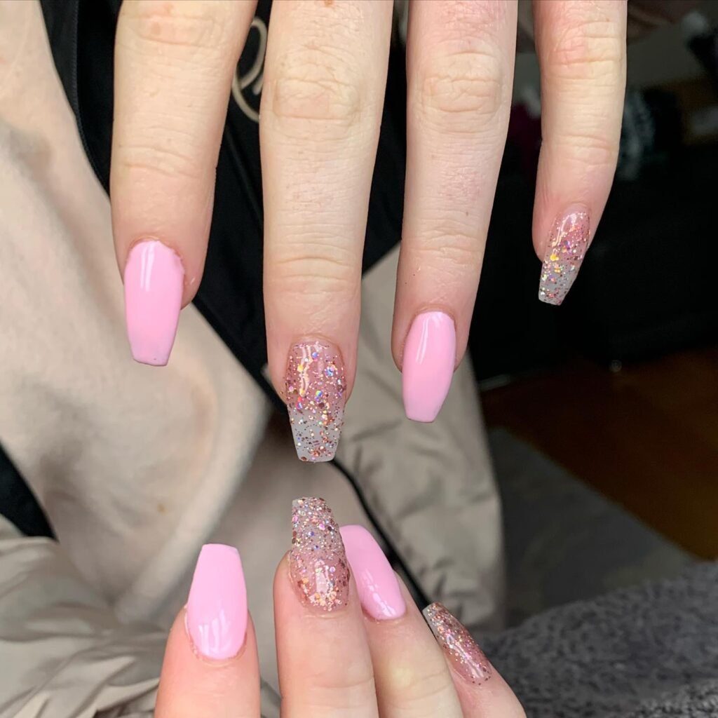 Rose Gold Chrome and Sparkly Accents Chrome ballerina nails ideas in rose gold or soft silver bring a subtle sparkle that enhances the elegant ballerina vibe. These metallic finishes work especially well when used on just one or two accent nails, creating beautiful contrast against matte or glossy pink ballerina nails.