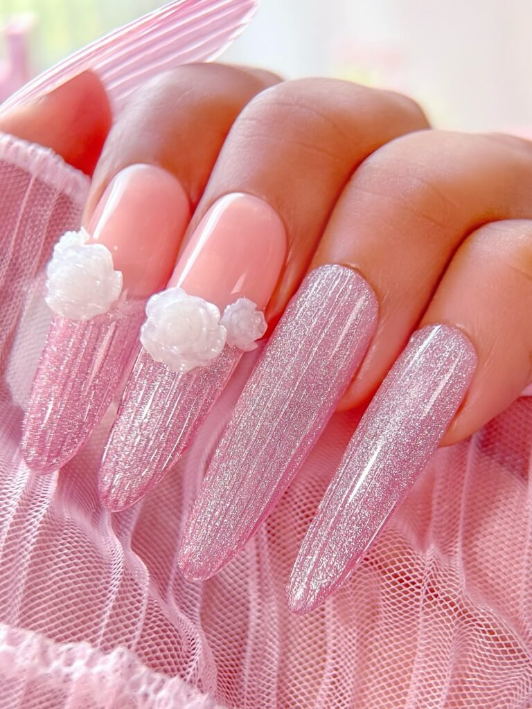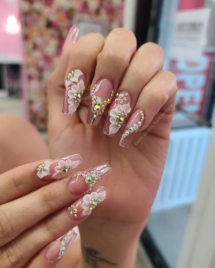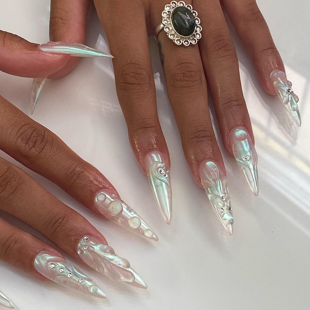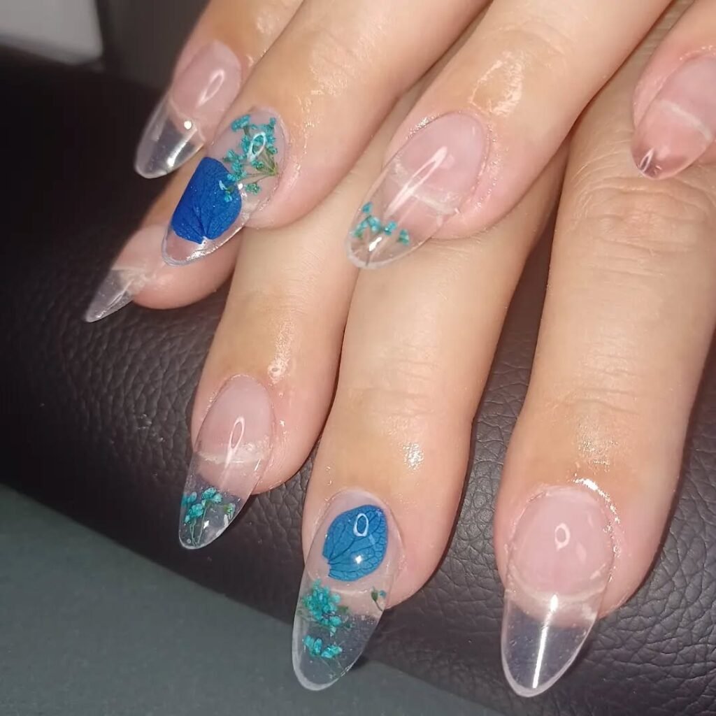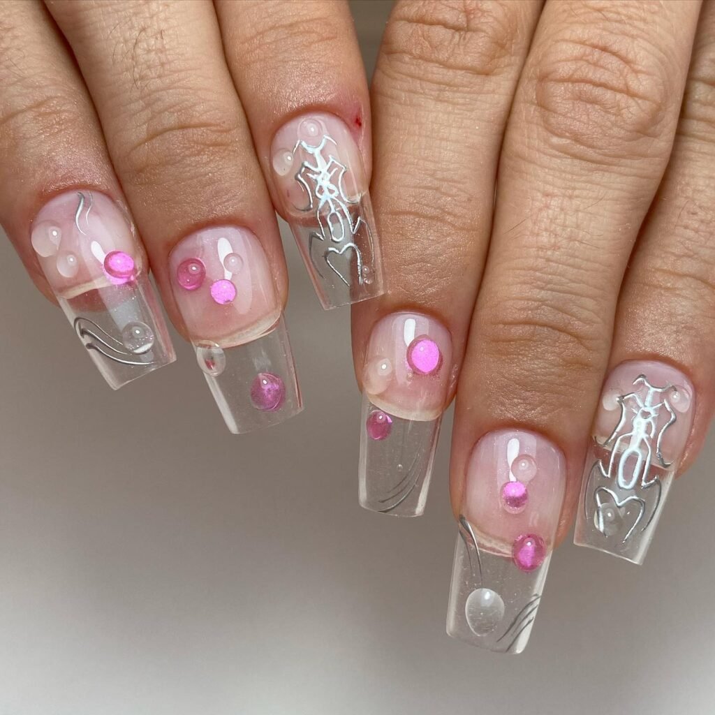 Tiny 3D Accents Like Flowers or Pearls Small 3D elements such as tiny chrome flowers or single pearls can transform a simple clear manicure. Place them strategically and they add personality while still feeling refined and elegant.