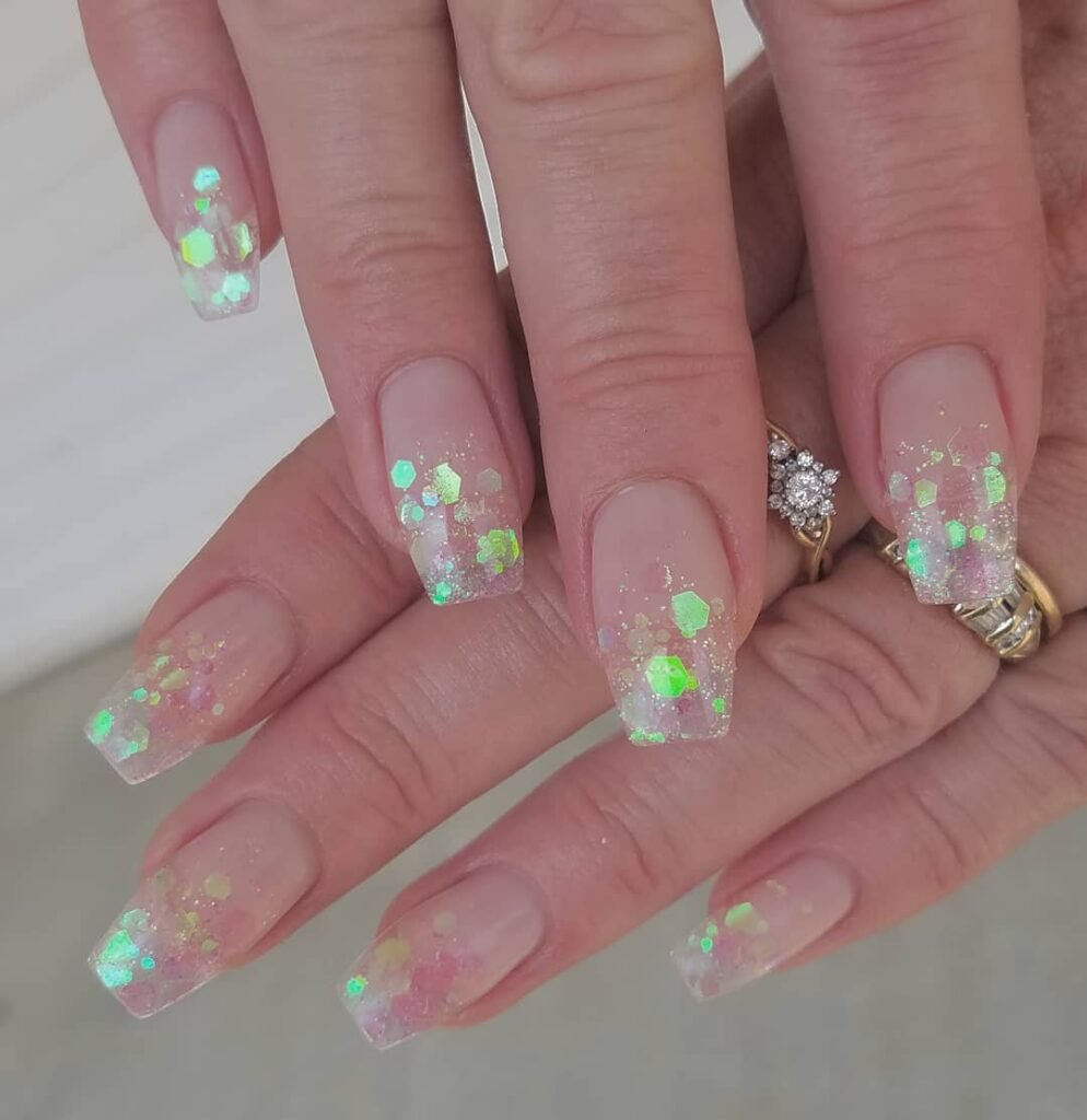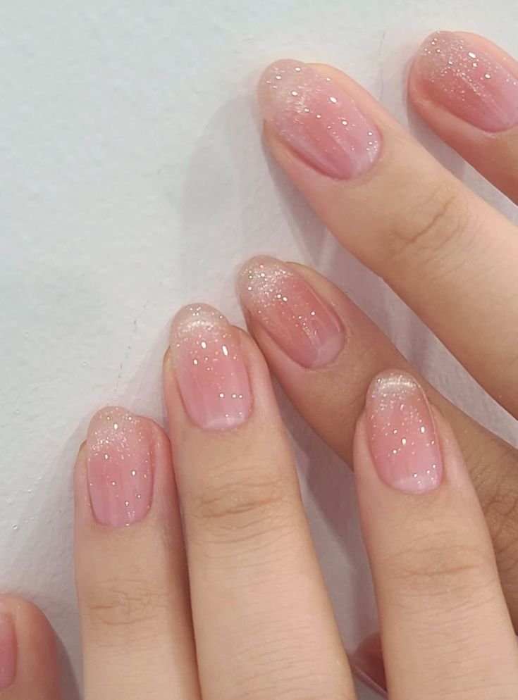 Subtle Glitter and Chrome Details For special occasions, add a touch of fine glitter or light chrome rub on just one or two nails. The contrast between the clear base and these delicate shimmers gives that natural glam pop without overwhelming the minimalist aesthetic.