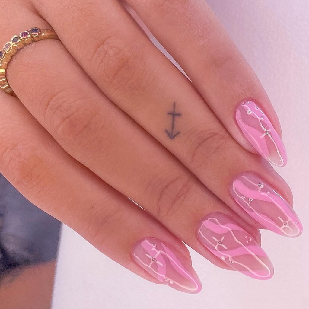 Almond Nails for Soft Feminine Glam Almond-shaped nails are the perfect match for clear designs. The soft tapered tip elongates your fingers and gives an elegant, refined appearance. The sheer finish on almond nails looks particularly expensive and graceful.