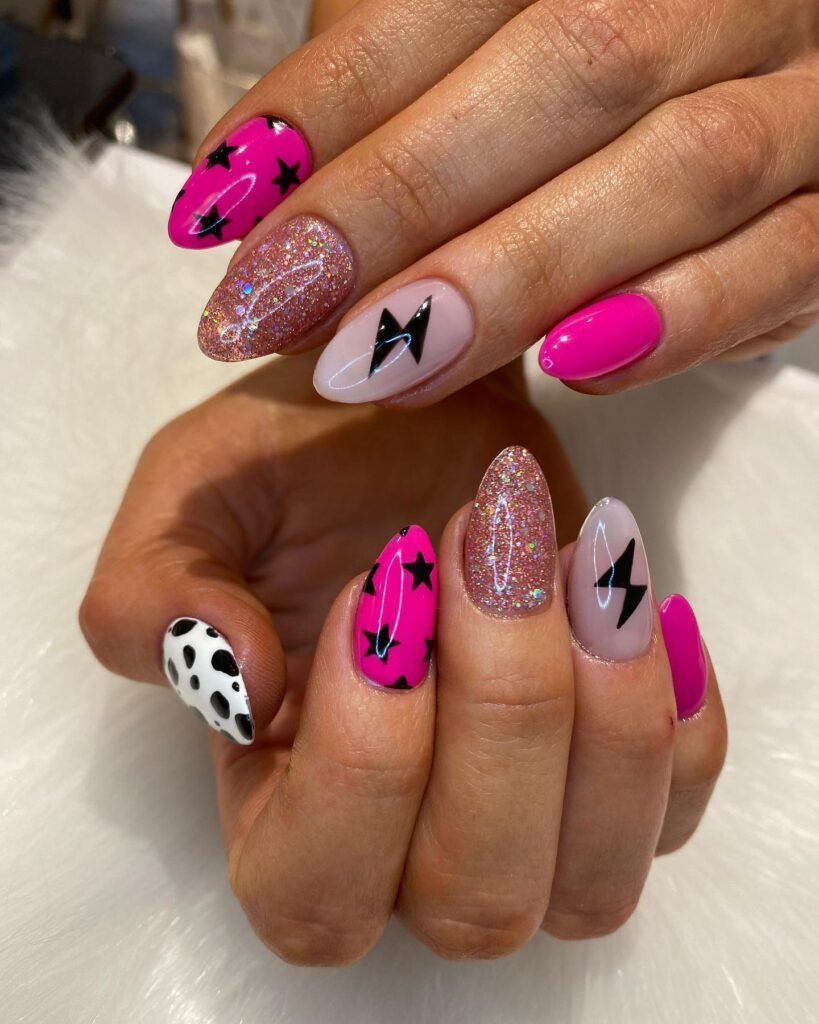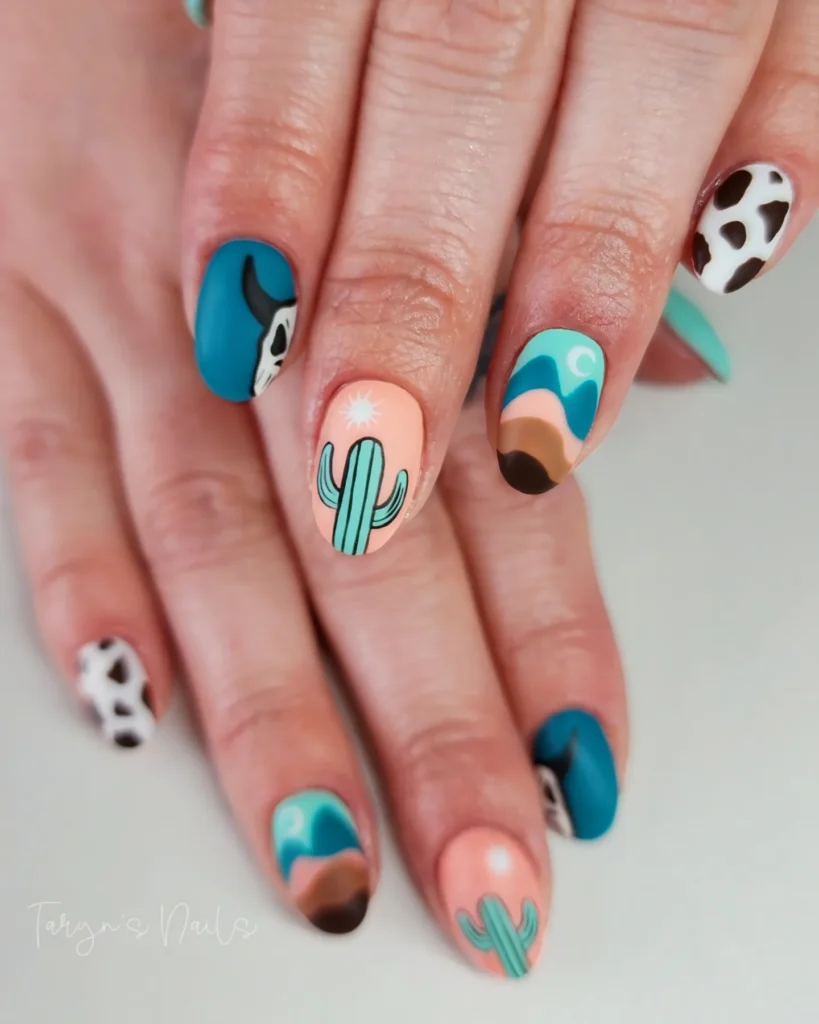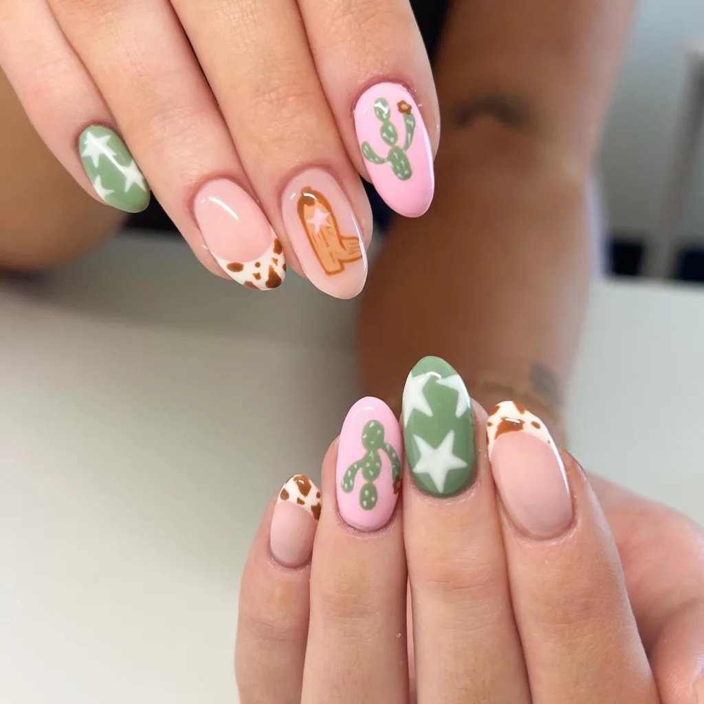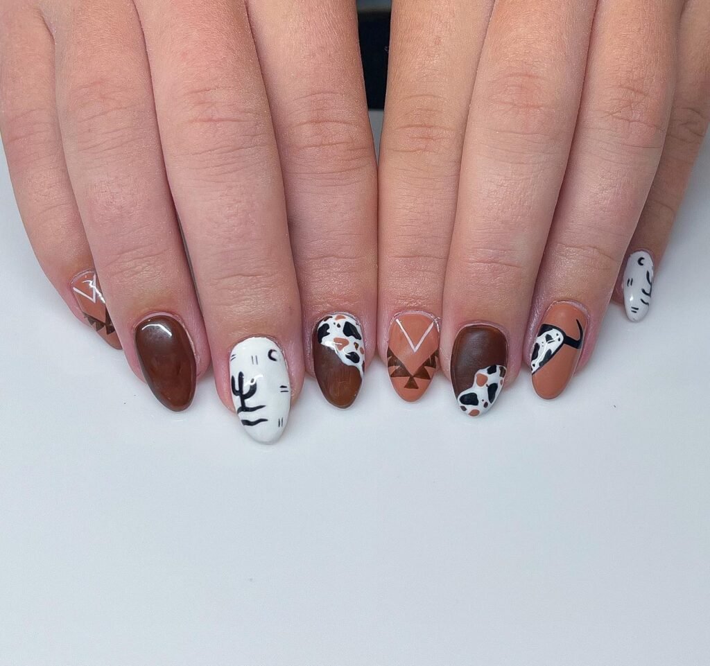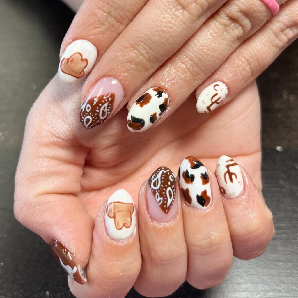 Cow print has evolved way beyond basic black and white. Nashville versions often mix brown and cream or add turquoise accents for a unique local feel. Bandana patterns in red and black look incredible as full nails or accent designs. Combining cow print with small western icons creates a cohesive theme that screams country without being overwhelming.
