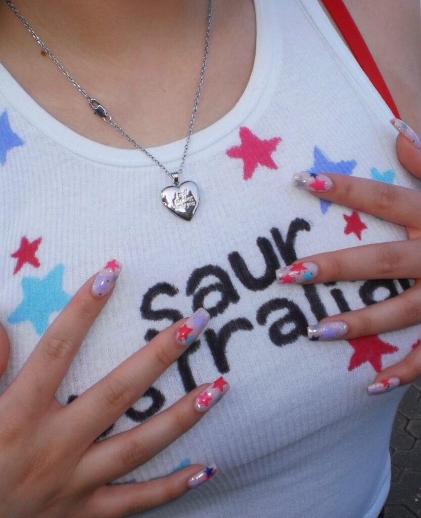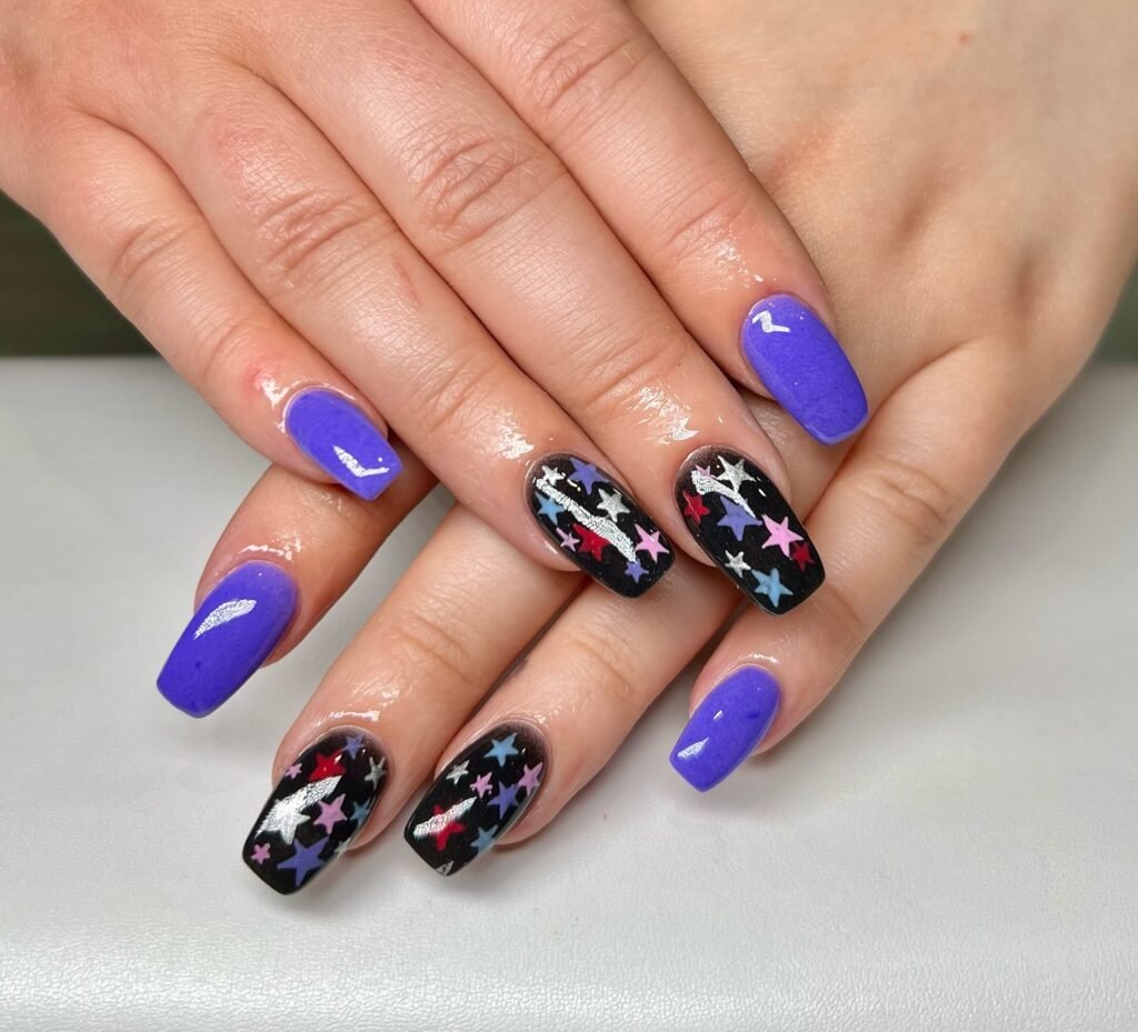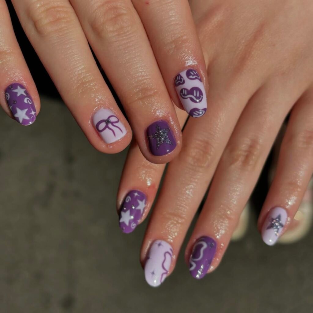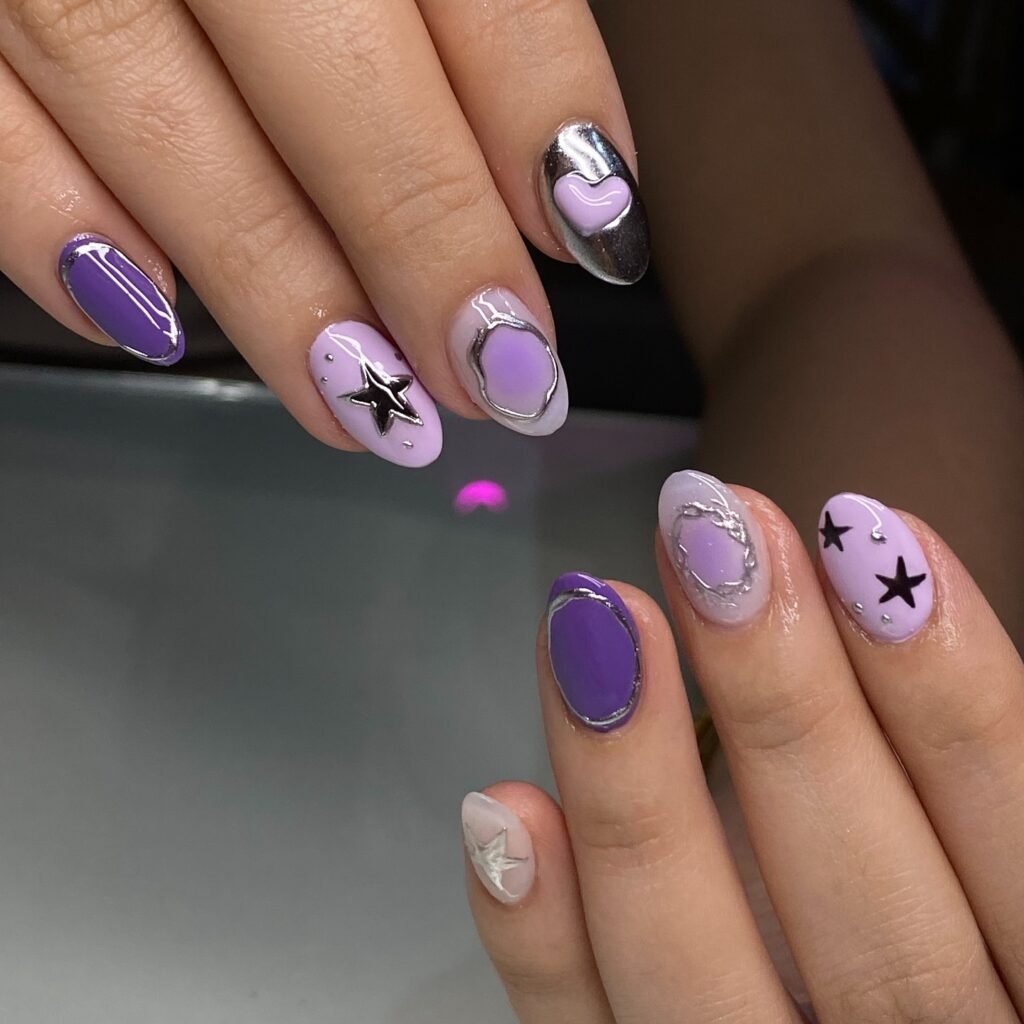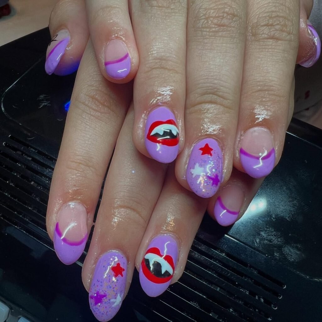 Cover deep purple nails with all-over silver stars that catch the stage lights beautifully. Adding a few small rhinestones on select nails brings concert glam without going overboard. These nails look incredible in photos and help maintain high energy throughout the show. They’re durable enough to survive hours of jumping and cheering.