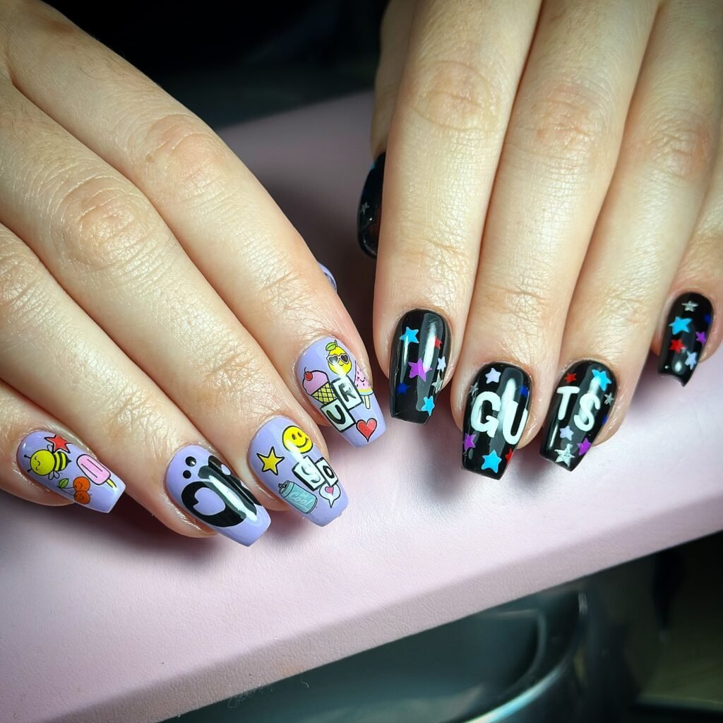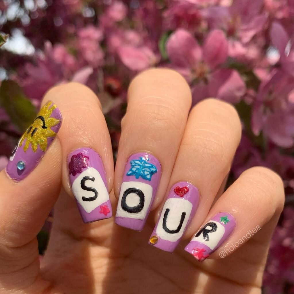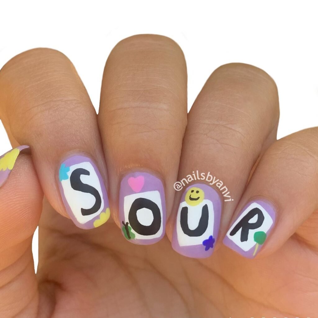Directly inspired by the SOUR album artwork, these nails feature cute sticker-like elements such as daisies, stars, or even the word “sour” in delicate lettering. A soft lavender matte finish keeps the vibe moody yet not too intense. This is a fun, youthful option that many fans recreate for its playful yet emotional feel, and it pairs beautifully with casual outfits or cozy nights in.