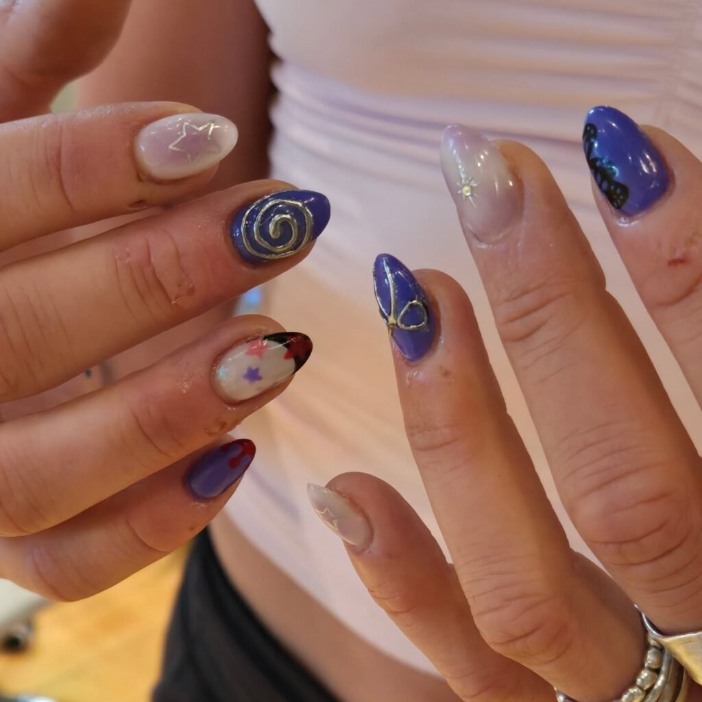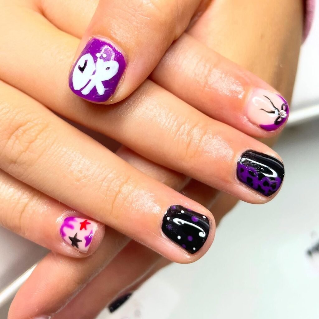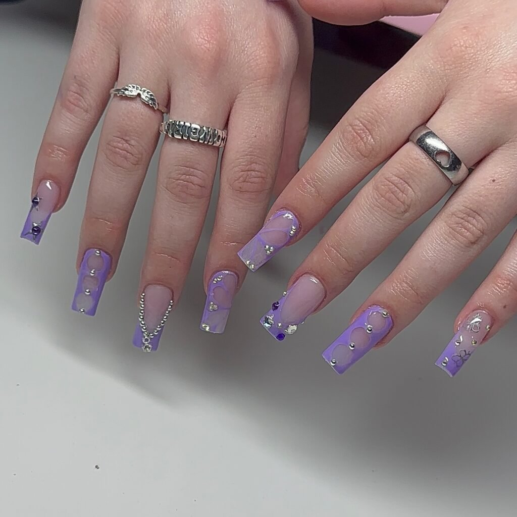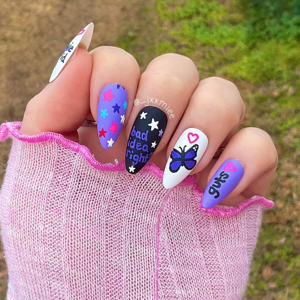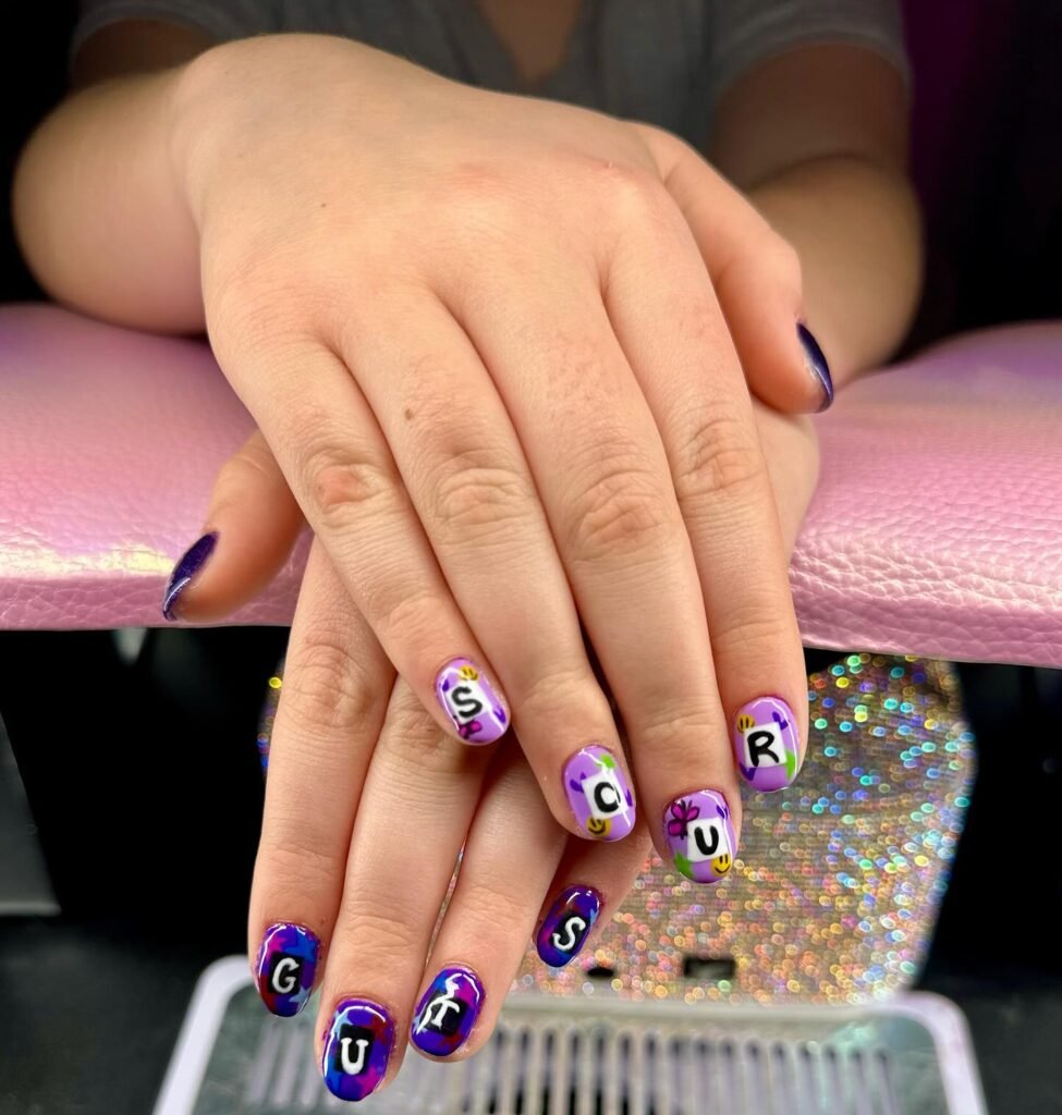 New to nail art? Custom press-on sets in GUTS purple with pre-designed butterflies and hearts make it simple. Many artists now offer ready-made Olivia Rodrigo inspired press-ons that can last up to two weeks. They’re a fantastic starting point for achieving professional-looking results at home without the salon commitment.