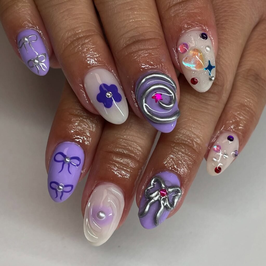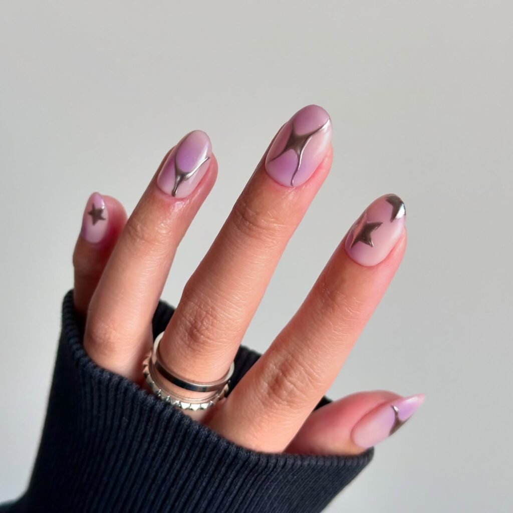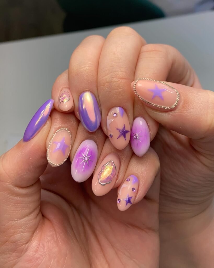 Create a beautiful transition from light lavender to deep purple with fine glitter scattered across. The ombre effect adds movement and depth while remaining easy to wear. This style flatters almost every nail shape and adapts to multiple moods throughout the week. It’s forgiving for beginners and looks expensive with minimal skill.