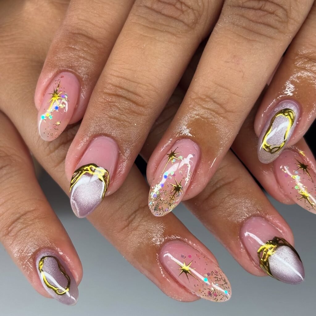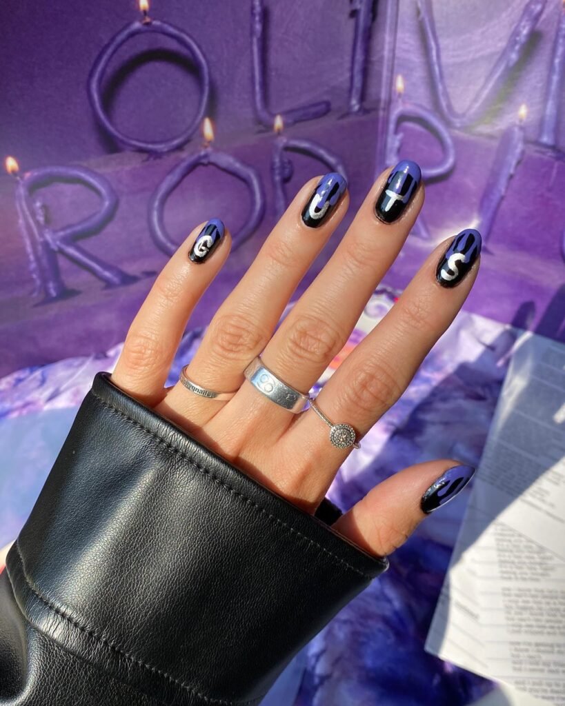 Dark purple nails scattered with silver stars bring cosmic energy straight from Olivia’s stage presence. Add fine glitter on the ring finger for extra dimension. This design shines on medium-length nails and works with almost any outfit when you’re ready to take on the world. It’s bold without being over-the-top and translates effortlessly from day to night.