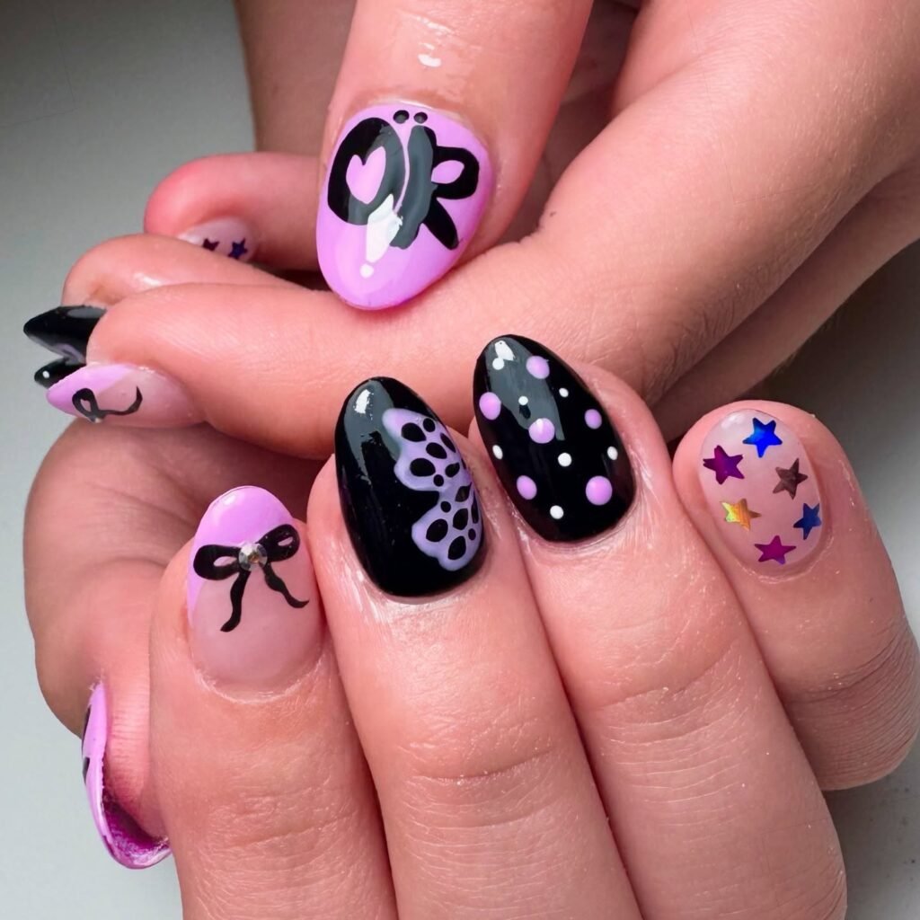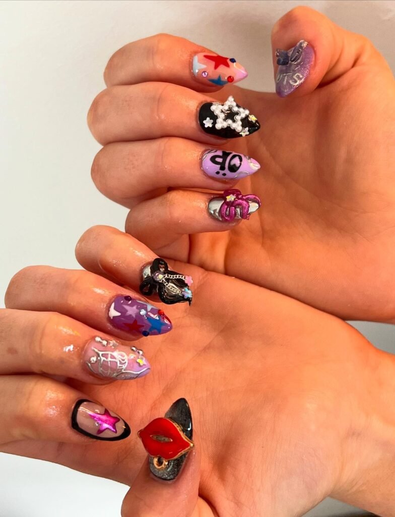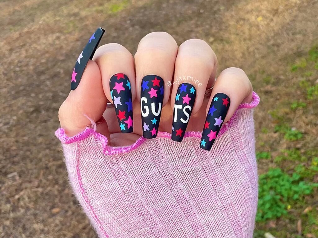 The most popular choice for concerts right now is giving each finger its own mini design – one butterfly, one star, one chrome purple, and one with a tiny lyric. This personalized approach screams GUTS World Tour energy. Keeping them at short to medium length makes them comfortable for dancing all night long while still looking like a full artistic set.