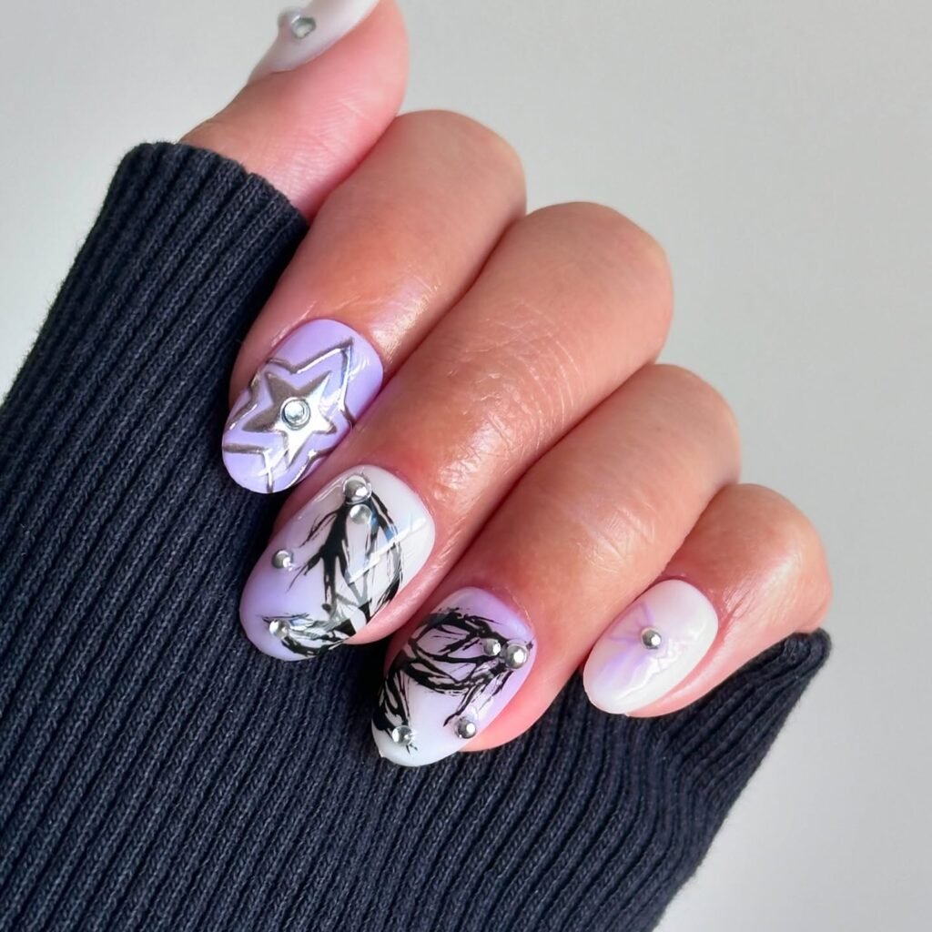 Nothing captures quiet heartbreak better than soft purple hearts on a lavender base. This design pays tribute to the emotional depth of “drivers license.” Opt for almond-shaped nails to create an elegant look. Paint tiny white or silver hearts on two accent fingers while keeping the rest a solid muted purple. It feels nostalgic and comforting when you’re in your feels, and the simplicity makes it easy to recreate at home or at the salon.