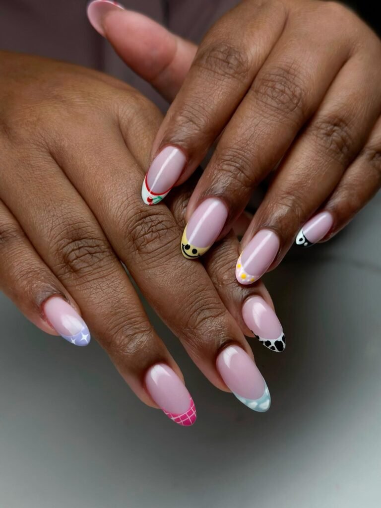 Start with clean, shaped nails and a thin base coat. Apply two coats of your main color, then use a dotting tool or fine brush for accents. Cure or let dry fully between steps. Finish with a high-shine top coat to lock in the glazed effect.