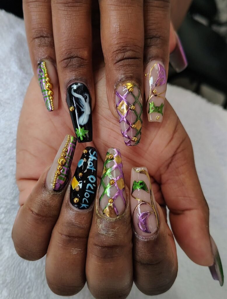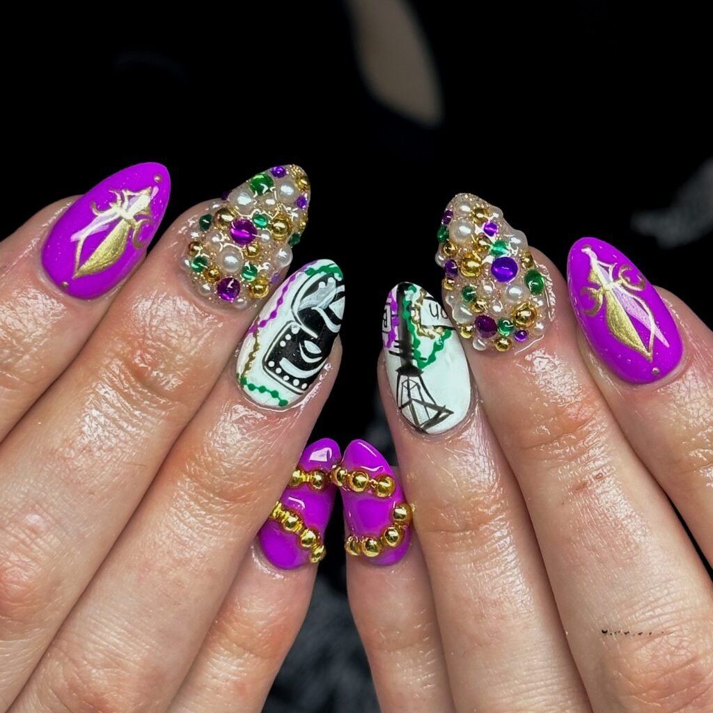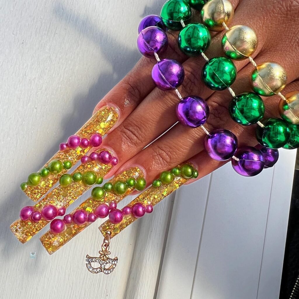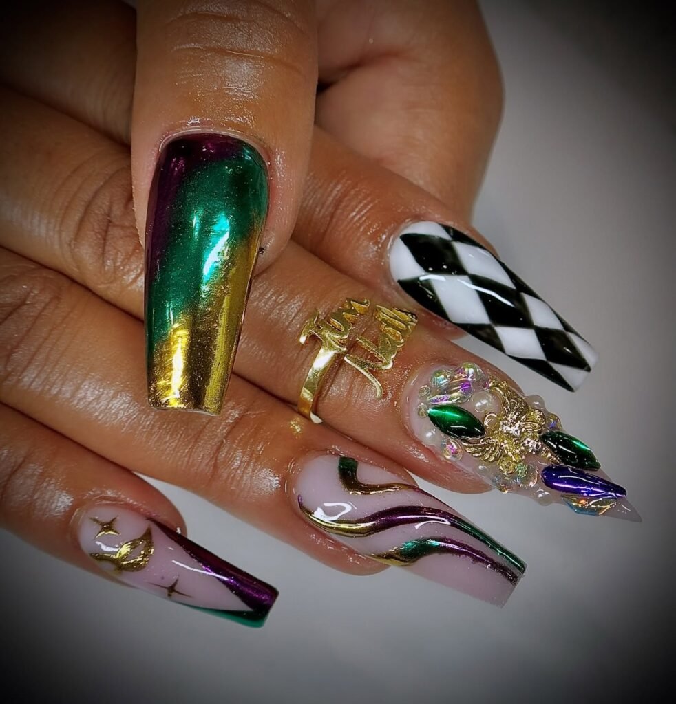 The tradition stretches back more than a century. Purple represents justice, green stands for faith, and gold symbolizes power—colors that have defined Mardi Gras parades and masquerade balls for generations. Today’s artists mix those classic hues with modern chrome finishes, 3D accents, and dazzling glitter to create looks that feel both nostalgic and completely fresh.
