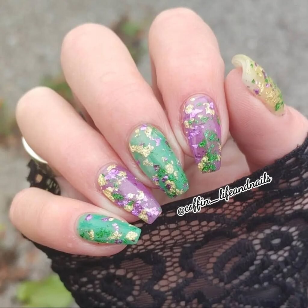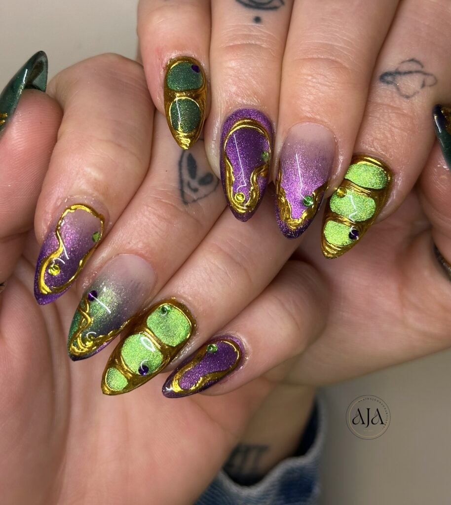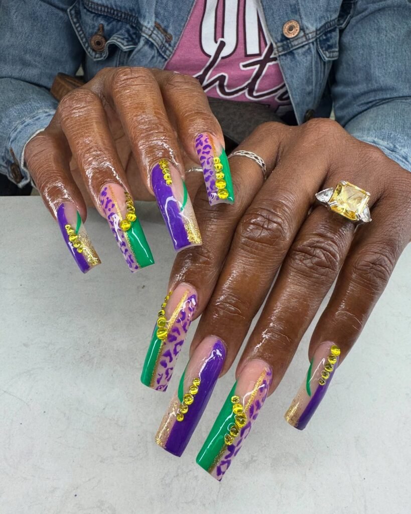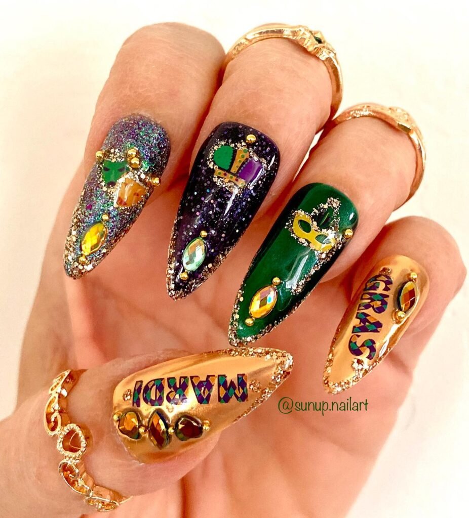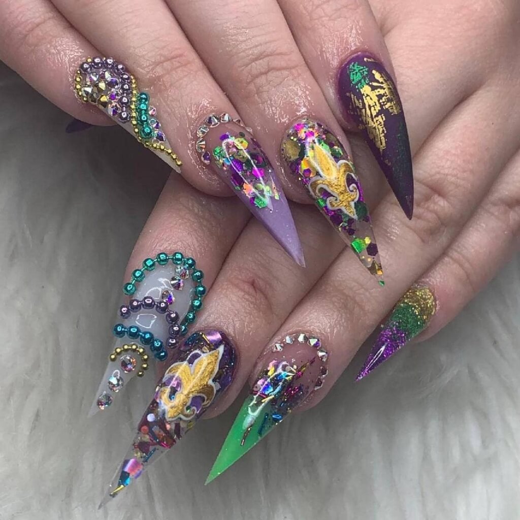 The tradition stretches back more than a century. Purple represents justice, green stands for faith, and gold symbolizes power—colors that have defined Mardi Gras parades and masquerade balls for generations. Today’s artists mix those classic hues with modern chrome finishes, 3D accents, and dazzling glitter to create looks that feel both nostalgic and completely fresh.