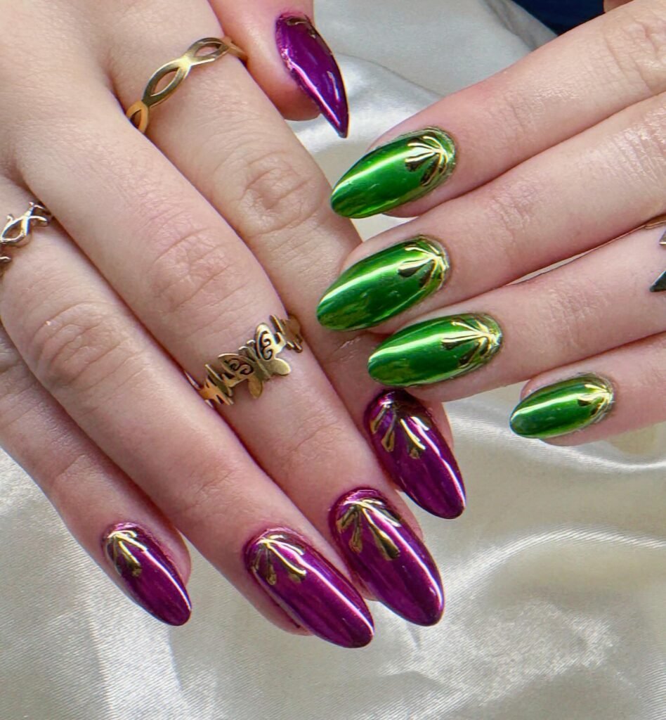 Chrome finishes reflect light with every movement, making your nails look expensive and full of energy under parade lights or party glow. Try a rich purple chrome base paired with thin green and gold accent stripes for a clean, regal finish that feels instantly luxurious. Another striking option uses gold chrome over a deep purple base with a soft glitter gradient that mimics the shimmer of passing floats and catches every camera flash.