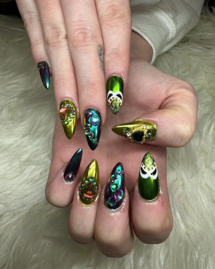 Hand-painted masquerade masks on one or two accent nails bring instant drama and storytelling to your manicure. Leave the rest of the nails in solid metallic green or add delicate gold outlines around each mask to keep the overall look balanced and elegant. Adding a soft watercolor effect behind the mask creates depth and gives the design a dreamy, artistic quality that stands out beautifully against any outfit.