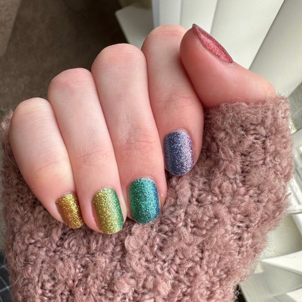 Upgrade a classic French tip by painting the tips in rotating shades of purple, green, and gold instead of white. A thin line of fine glitter at the cuticle instantly elevates the look and requires almost no artistic skill. The result feels polished and intentional while remaining incredibly simple to recreate at home.