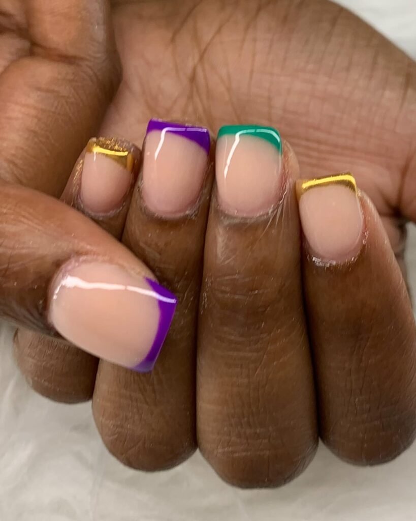 The signature trio of purple, green, and gold remains the heart of every Mardi Gras manicure because the colors instantly signal celebration. Alternate them across your fingers or create bold color blocks that pop from a distance. A purple base with green and gold glitter tips delivers that perfect balance of tradition and modern flair, making it ideal for everything from daytime parades to nighttime balls.