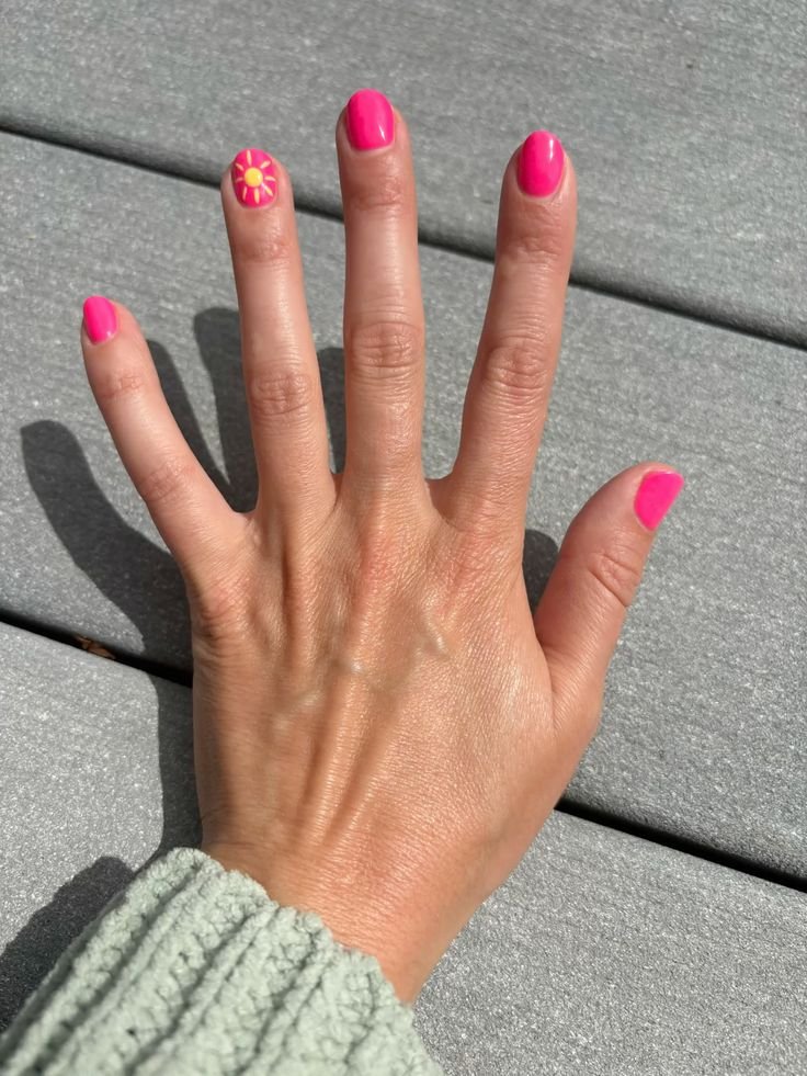 Paint most nails a solid shade, then add a fun detail—like a tiny pineapple or sun—on one finger. It’s simple but makes your manicure feel unique.