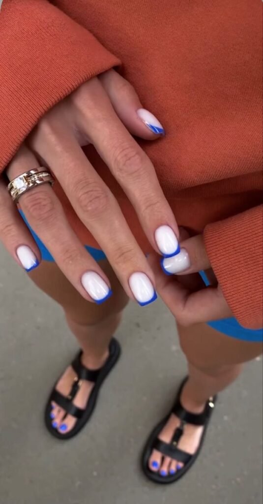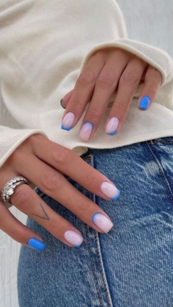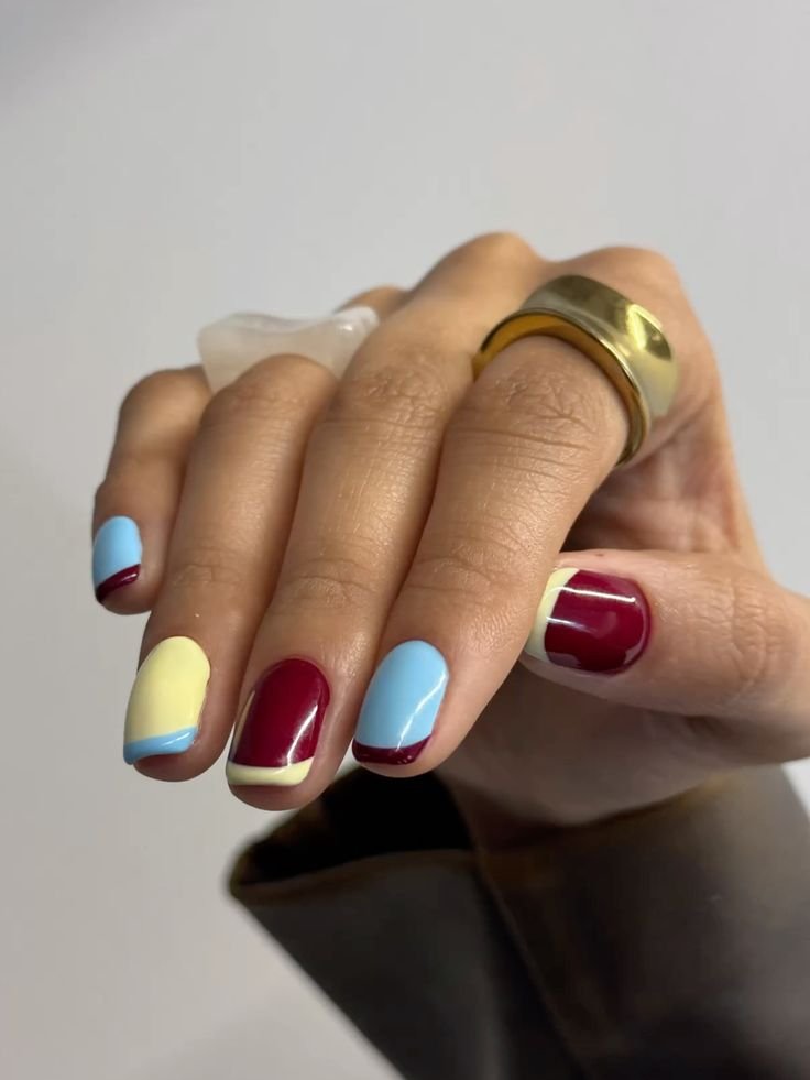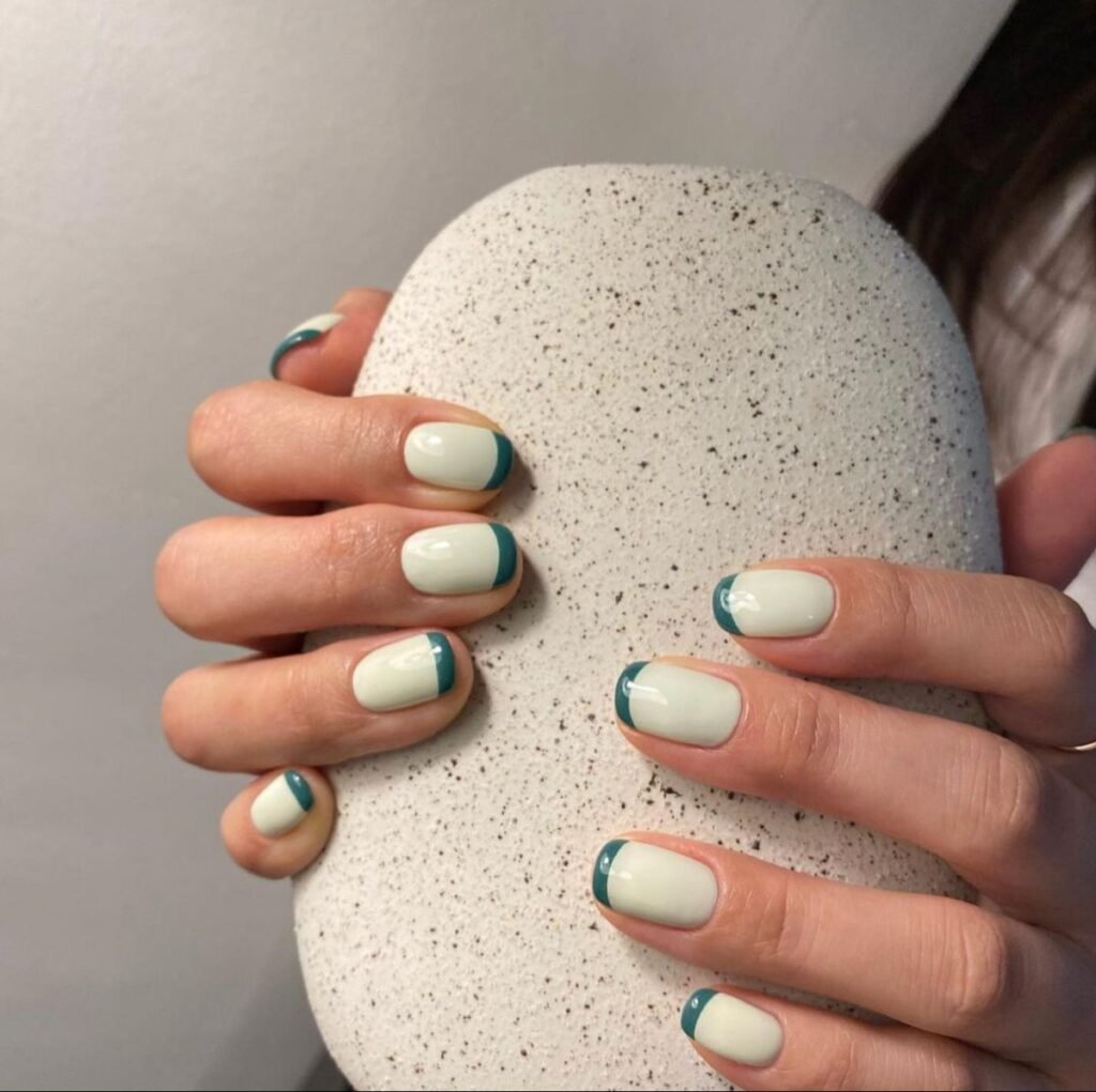 Split your nail into two shades—diagonal or straight across. Try combinations like white and coral or blue and nude for a clean, modern feel.