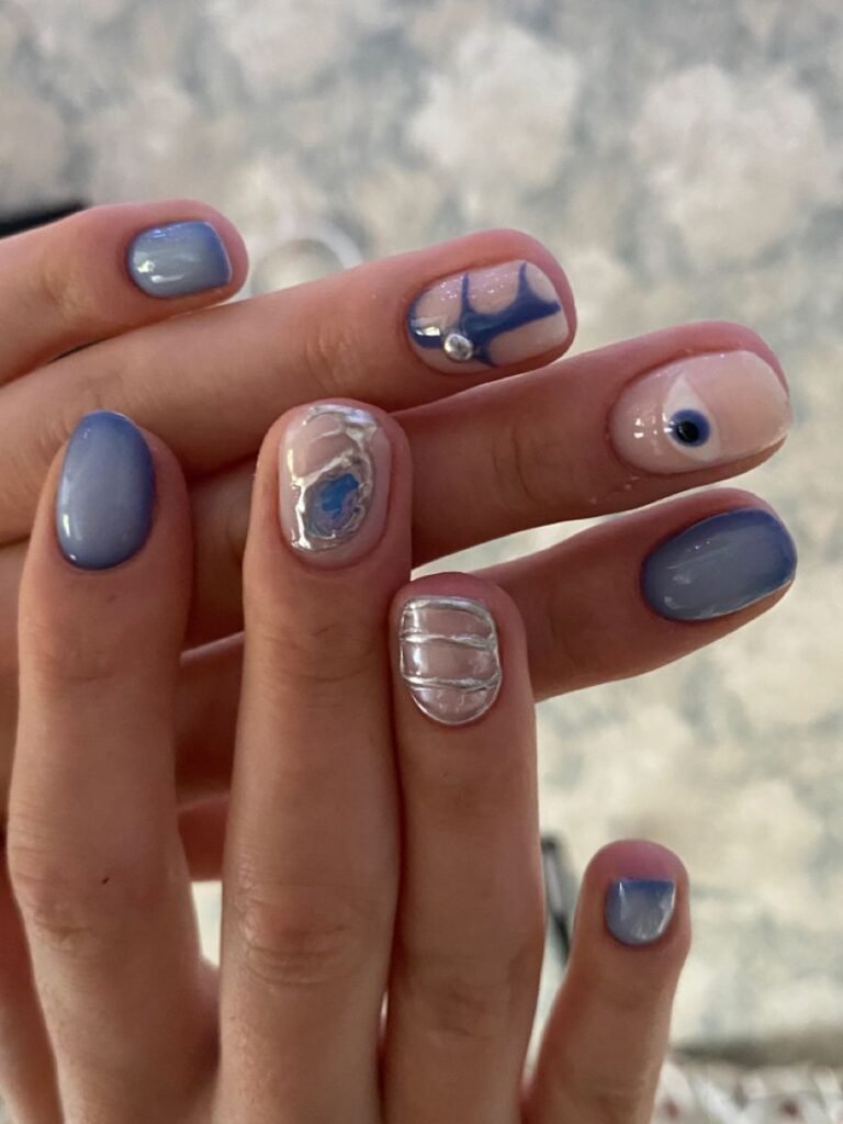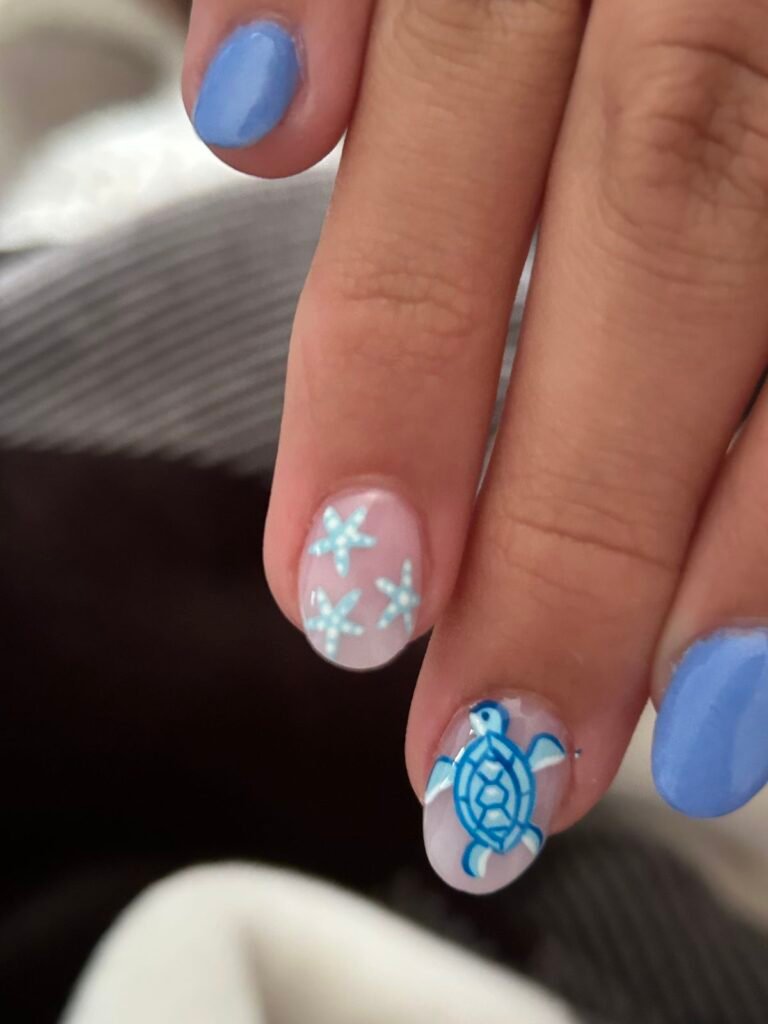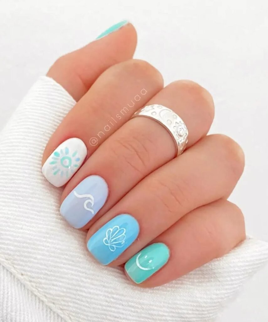 A tiny shell accent on a neutral or pale blue base gives coastal energy without going overboard. Keep it minimal for a chic finish.