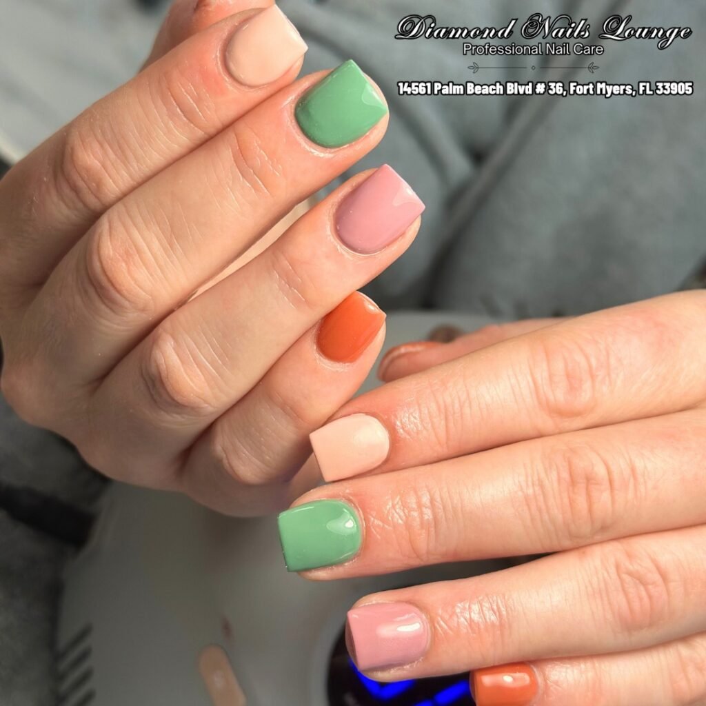 Squoval nails that have summer neons or winter berry styles. For cozy weather, wrap nails in velvet and for summer use jelly finishes.