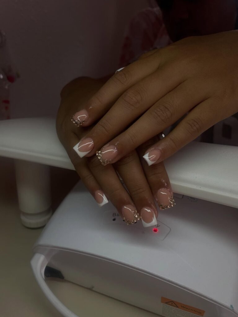 Classic white tips for the bottoms and colored tips for the top like neon green. Nods to Valentine’s Day are possibilities with the addition of micro hearts.