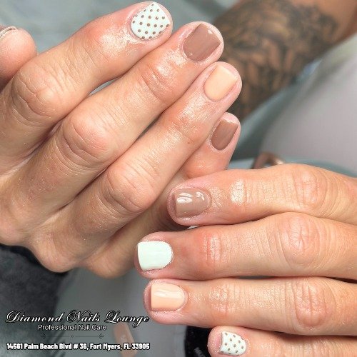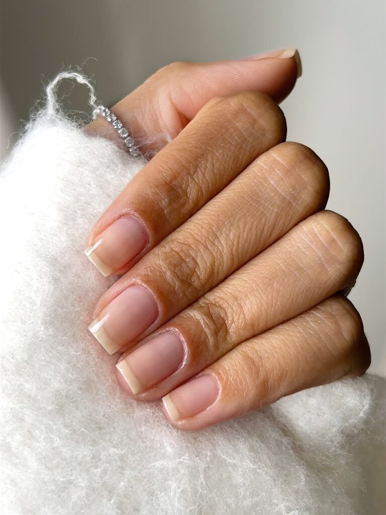 Soft beige and nude tones gives an elegant base. With a glossy top coat adds a “quiet luxury” style that is timeless.