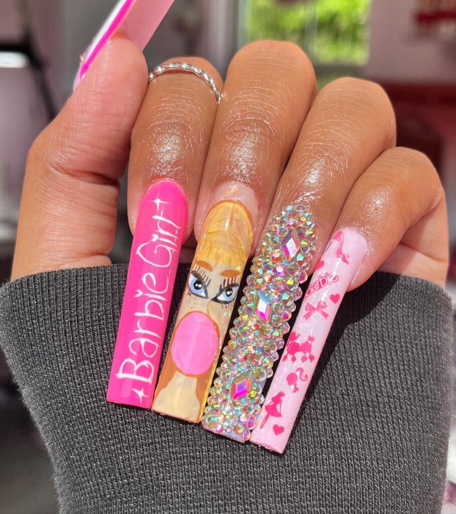 Barbie nail inspirations offer room for individualization with gel, acrylic, or press-on nails; nails can be designed in colors or with embellishments to match skin tone and preference.