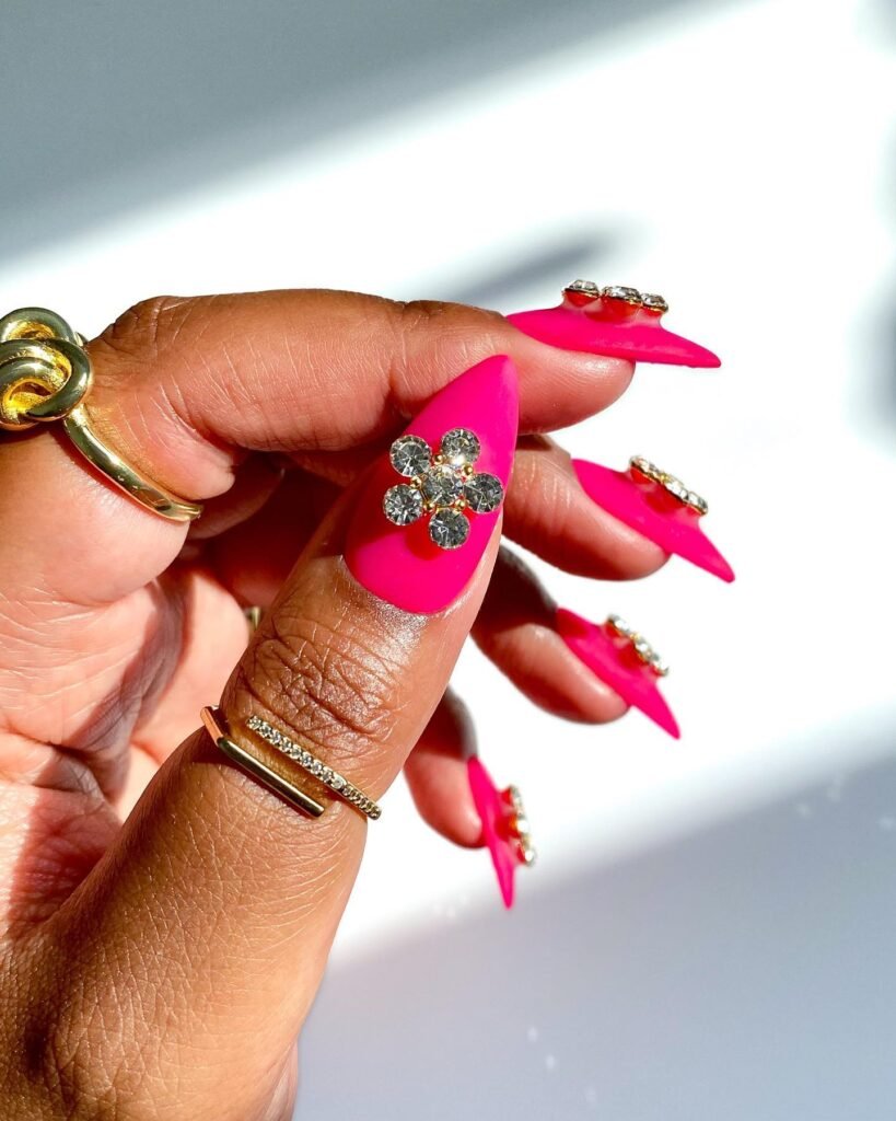 Coffin shapes are long and slightly tapered at the tip, which means they are great for dramatic glitter and 3D elements, making your Barbie nails stand out for the occasion.