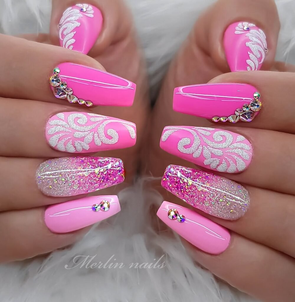 Add small rhinestones to your Barbie nail manicure and arrange them to form motifs like crowns and ribbons to enrich the elegance.